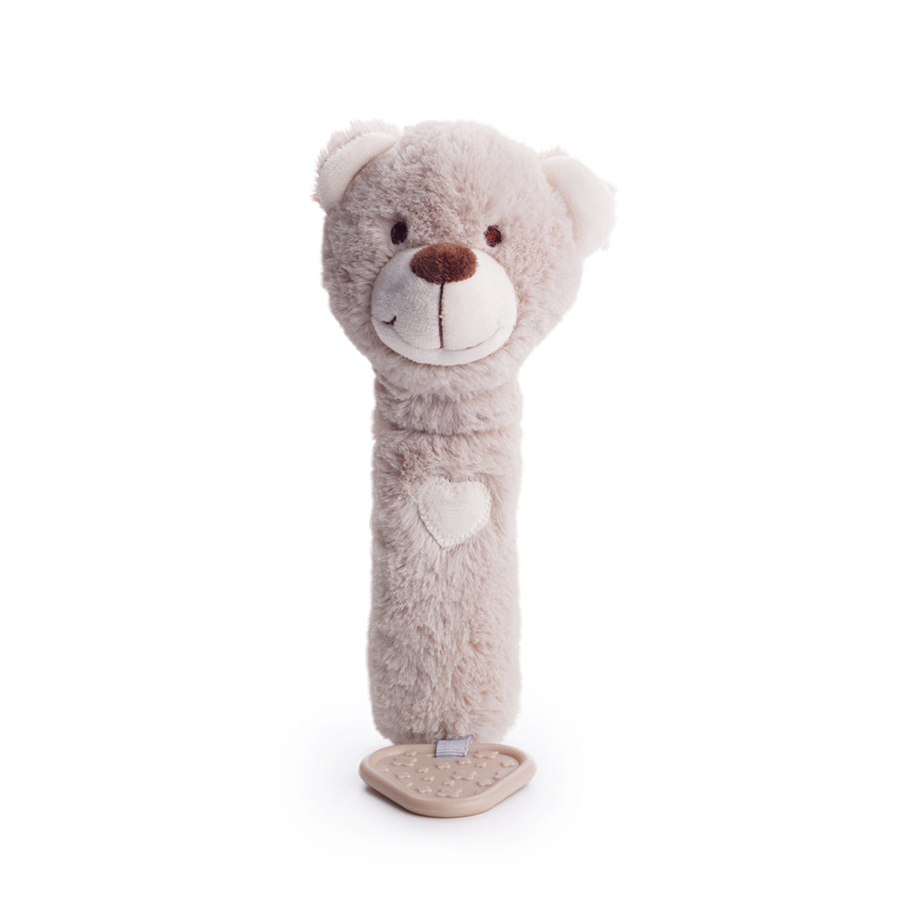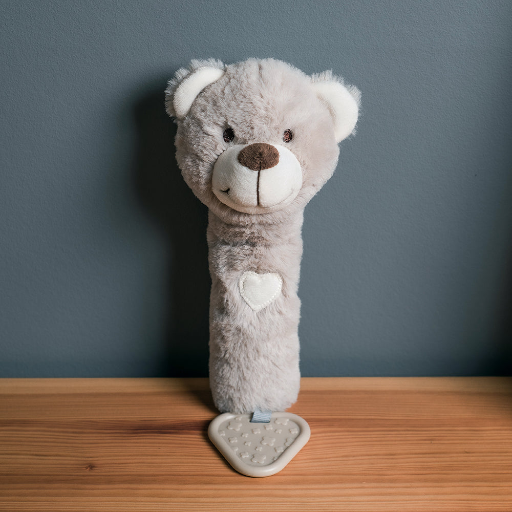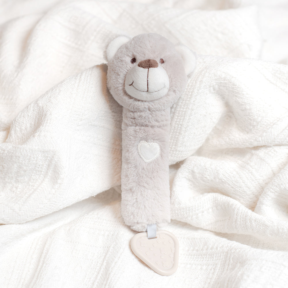A rattle, squeaker and teether all in one. This super soft, plush Rattle has been crafted using soft and safe material that is kind on babys skin. Designed to aid baby development through sensory play, this squeaker is the perfect newborn gift and is sure to become an instant bedtime favourite. Soothe teething gums with the sturdy teether attached to the bottom, or give it a squeeze to hear the cute squeak. Specially designed in a neutral colour making it ideal for any baby and to ensure little minds arent overwhelmed in their first months. Perfectly sized for tiny hands as they learn to touch, feel and grip. Conforms to current European safety standards. Suitable from Birth. Height: 30.6cm, Width: 12.4cm.
