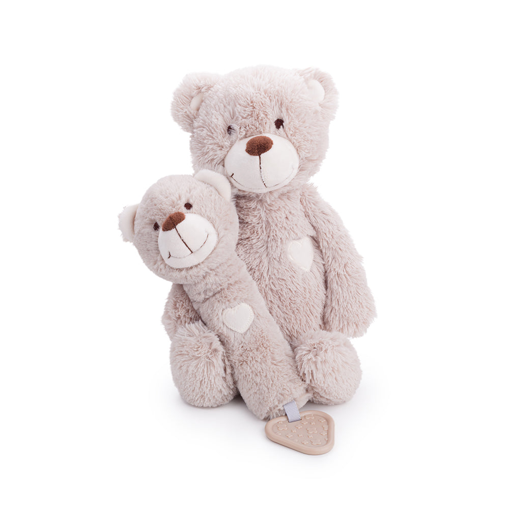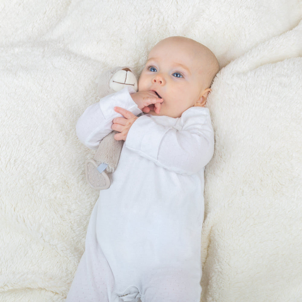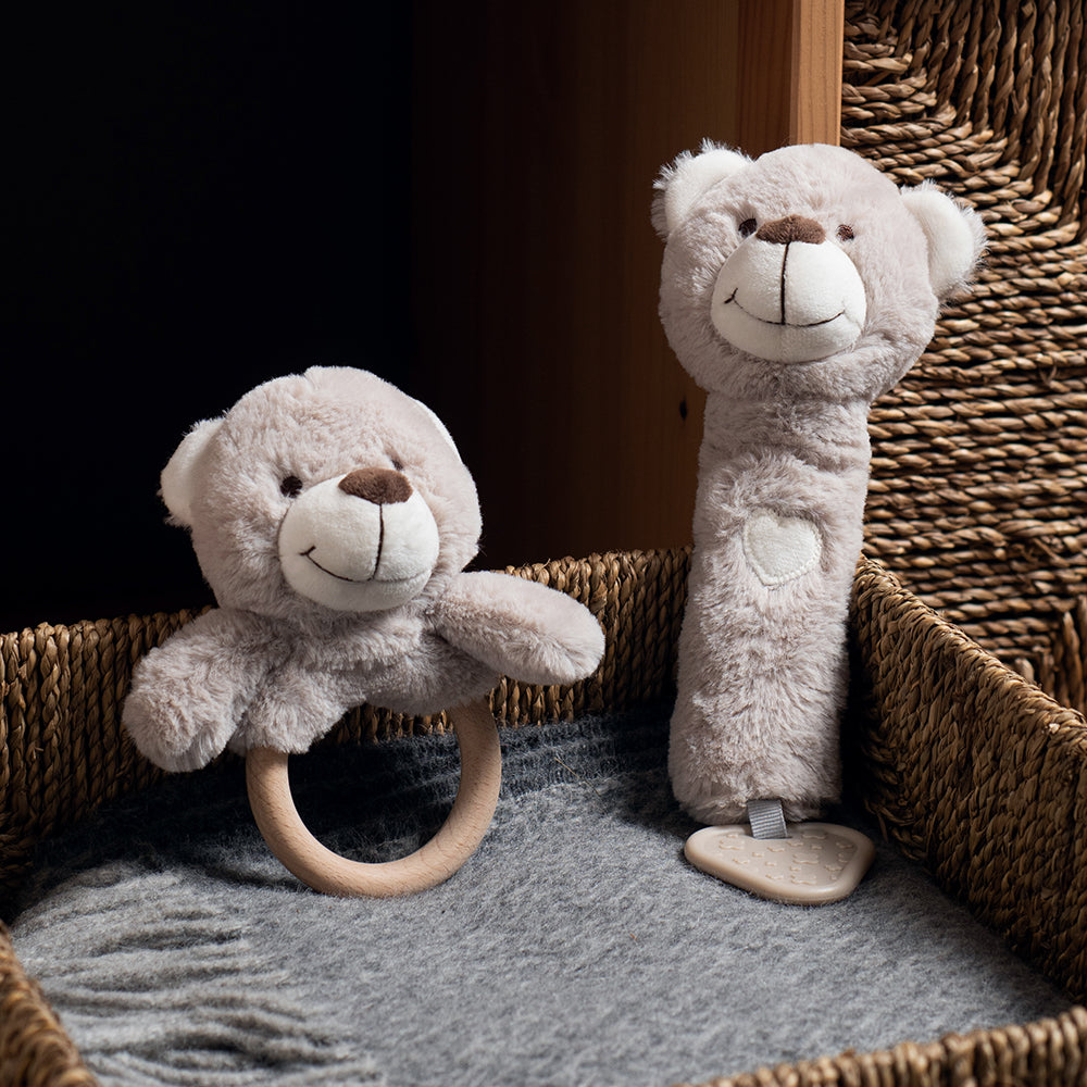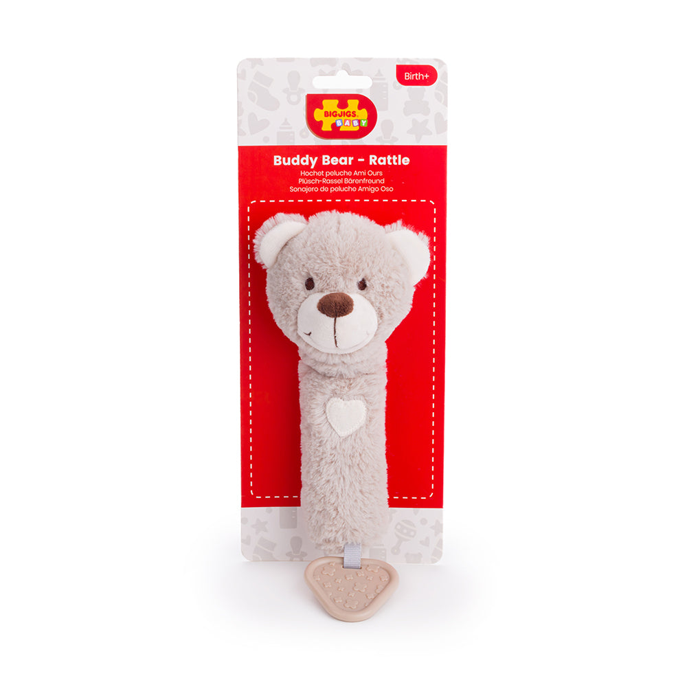 A rattle, squeaker and teether all in one. This super soft, plush Rattle has been crafted using soft and safe material that is kind on babys skin. Designed to aid baby development through sensory play, this squeaker is the perfect newborn gift and is sure to become an instant bedtime favourite. Soothe teething gums with the sturdy teether attached to the bottom, or give it a squeeze to hear the cute squeak. Specially designed in a neutral colour making it ideal for any baby and to ensure little minds arent overwhelmed in their first months. Perfectly sized for tiny hands as they learn to touch, feel and grip. Conforms to current European safety standards. Suitable from Birth. Height: 30.6cm, Width: 12.4cm.