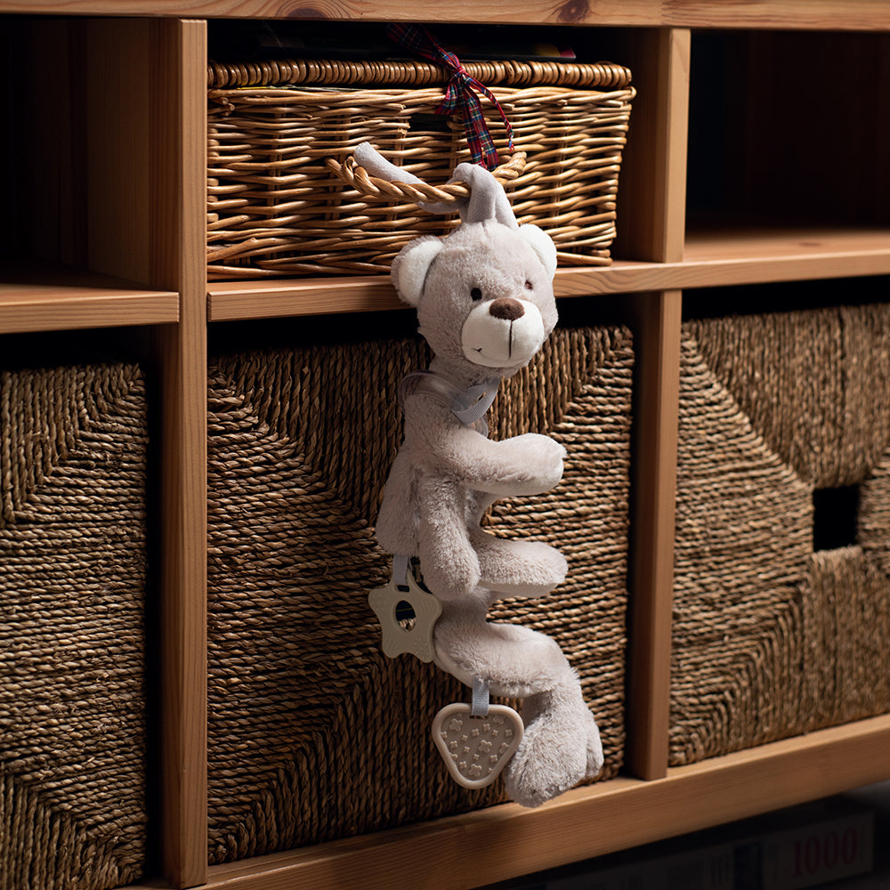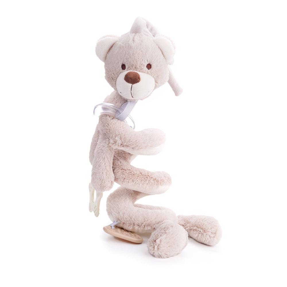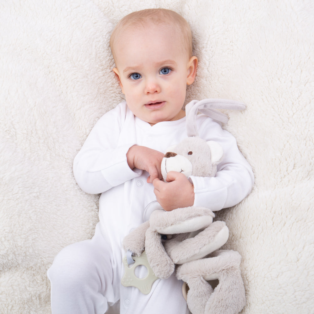 Little ones will love exploring new sensations with this plush Spiral Rattle; crafted using soft and safe materials that are kind on babys skin. Designed to aid baby development through sensory play, this rattle features a sturdy attachment perfect for attaching to a cot, pushchair, pram and car seat to comfort and entertain little ones on the go or at bedtime. Features a stretchy body, rattle and sturdy teether. Designed in a neutral colour making it ideal for any baby and to ensure little minds arent overwhelmed in their first months. Perfectly sized for tiny hands as they learn to touch, feel and grip. Conforms to current European safety standards. Suitable from Birth. Height: 30.6cm, Width: 16.8cm.