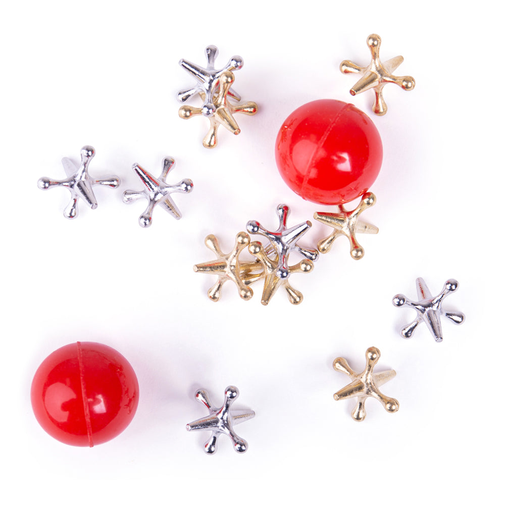 Our Jacks Game comes complete with 10 silver and gold jacks as well as two red bouncy balls. Compact and lightweight, it's ideal for taking on the go. Jacks helps kids to develop their fine motor skills and dexterity as they collect as many jacks before the ball bounces back down.