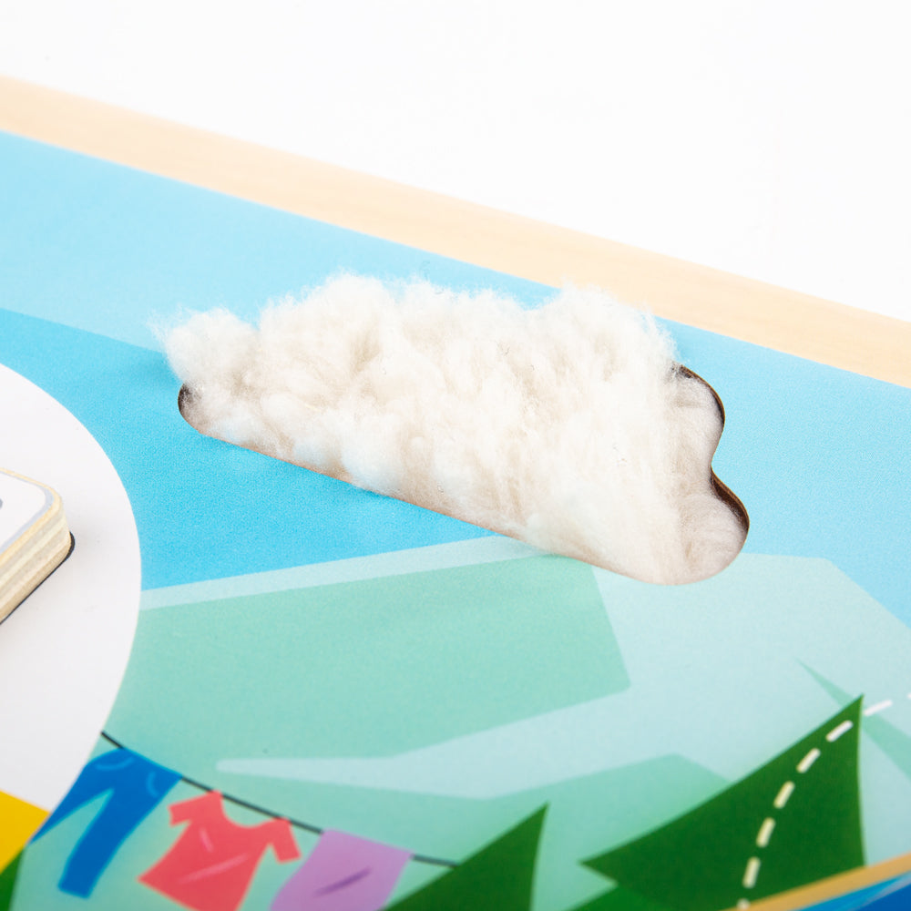 Encourage little ones to explore through sight and touch with our wooden Sensory Boards. Whats going on in the scene? Open the caravan door to see whats hiding behind it! Who is in the tent? What can you see and touch behind the cloud? Encourage children to discuss the scene and what they see. Develops vocabulary and encourages storytelling. Great for sensory development and developing hand/eye coordination, fine motor skills and dexterity. Made from high quality, responsibly sourced materials. Conforms to current European safety standards. Age 3+ years.
