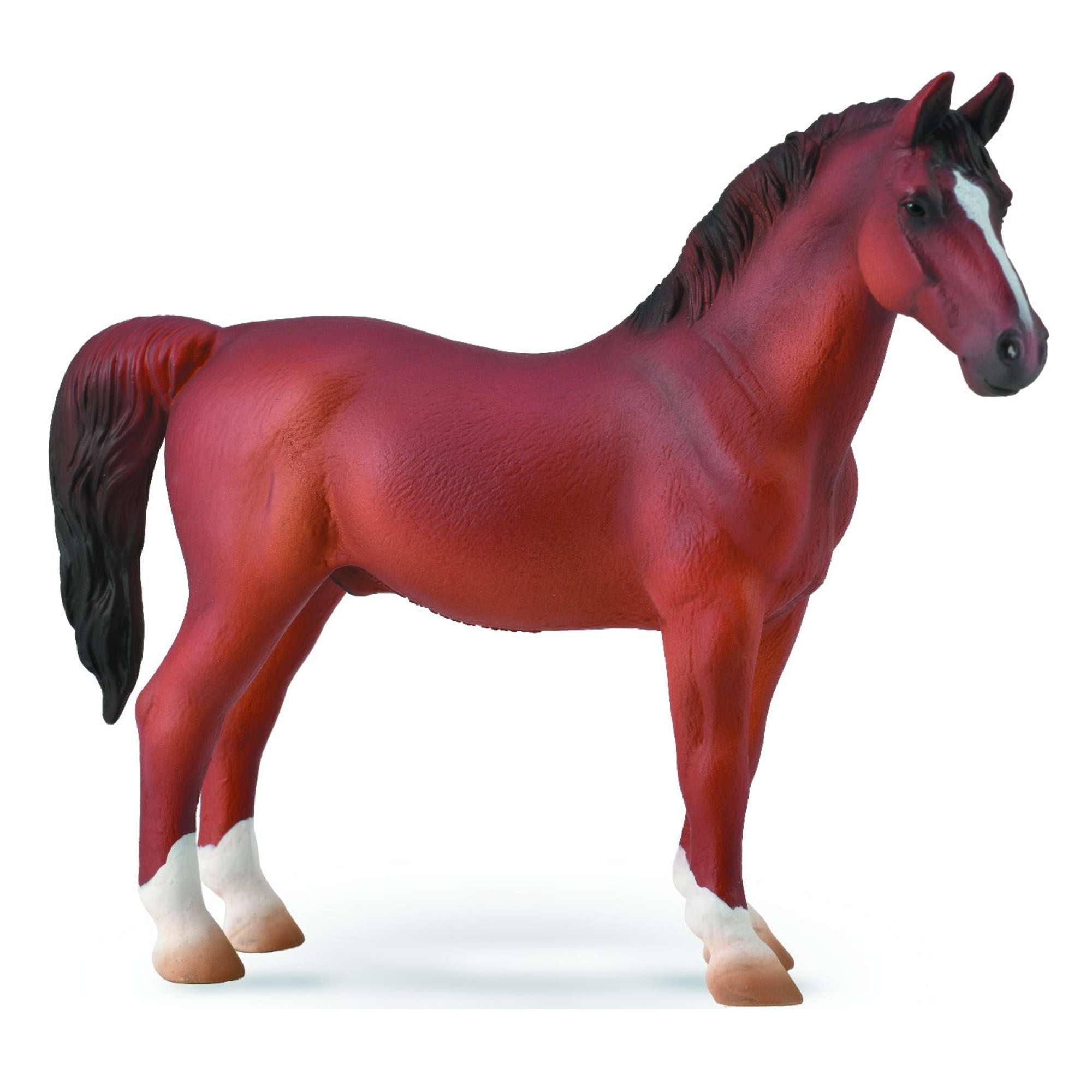 The Hackney Horse originated in Norfolk, England as a swift, elegant riding horse. Over time its reputation also grew as an outstanding driving horse due to its spectacular, high stepping trot and stamina. The modern Hackney is a versatile breed used for both show and pleasure. The CollectA model is a Hackney Stallion in Chestnut.