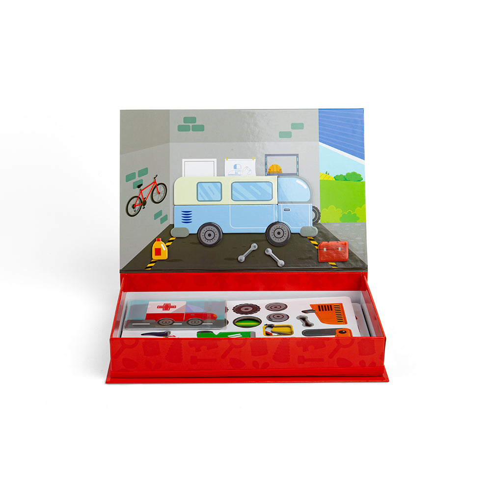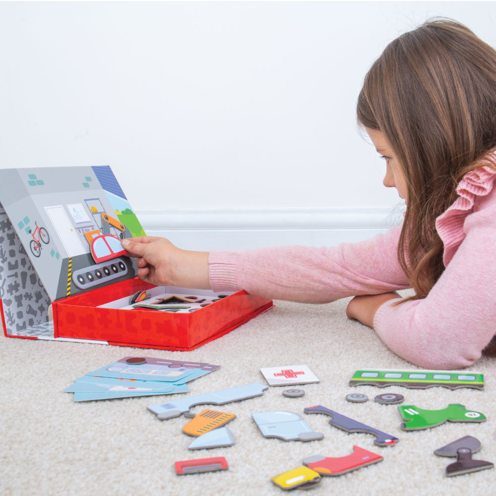 Great quality; nice thick magnetic board and a clever fold-out base design. It would be even better if the pieces were interchangeable so you could ‘mix and match’ the vehicle tops and bottoms.