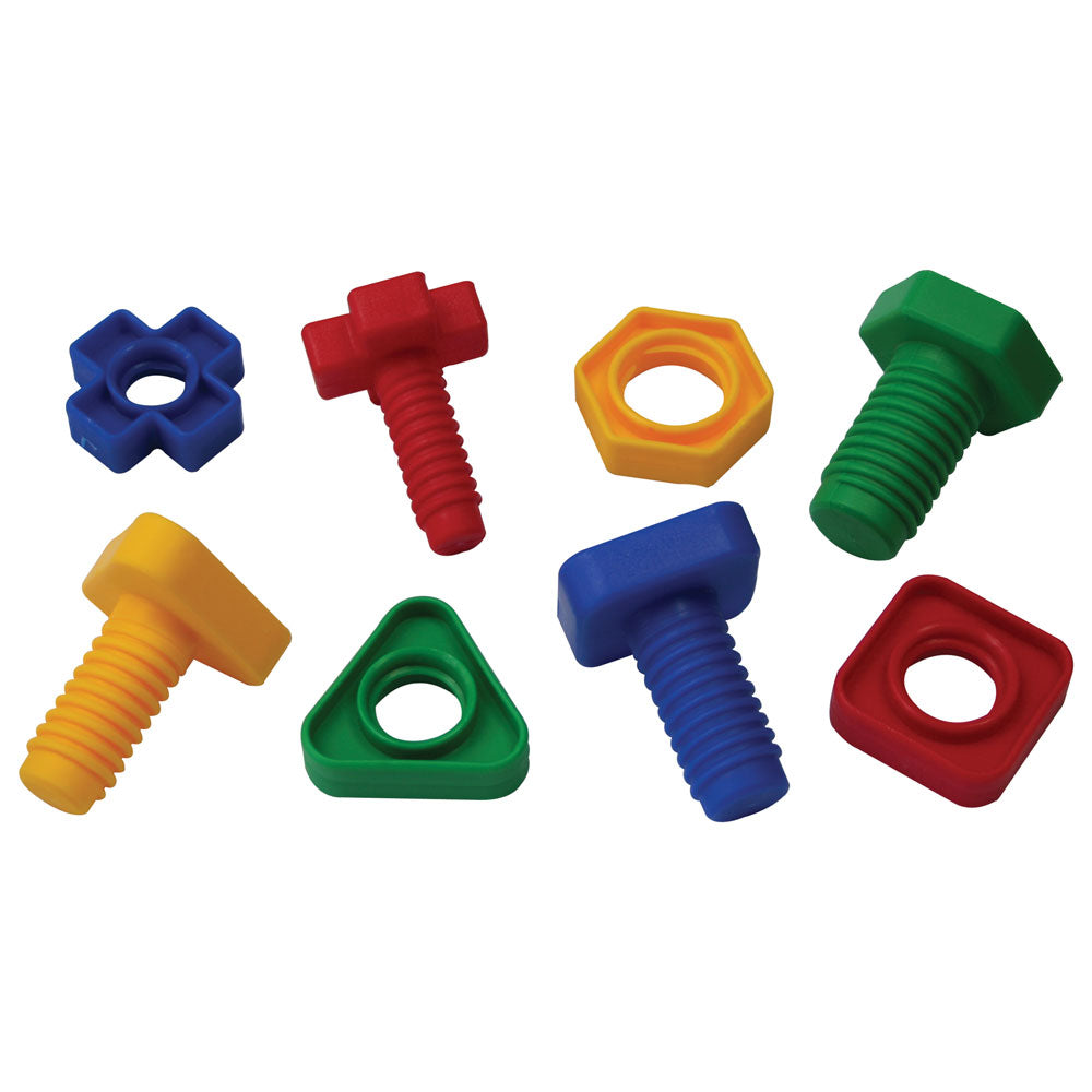 Extend the DIY possibilities with these pretend play plastic Nuts & Bolts. Includes 128 pieces. Chunky size is ideal for little hands to grip.