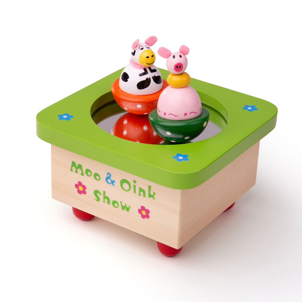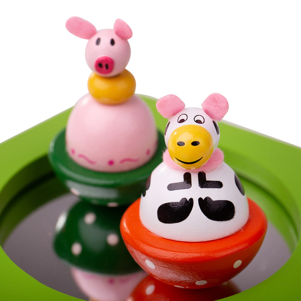 Moo and Oink are attached to the mirrored base via hidden magnets, but can be easily removed for playing with on the floor or table! The safe mirrored base adds another dimension to this classic toy, allowing little ones to watch the reflections of the characters too! A delightful addition to any playroom or nursery. Encourages creative and imaginative play. Made from high quality, responsibly sourced materials. Conforms to current European safety standards.