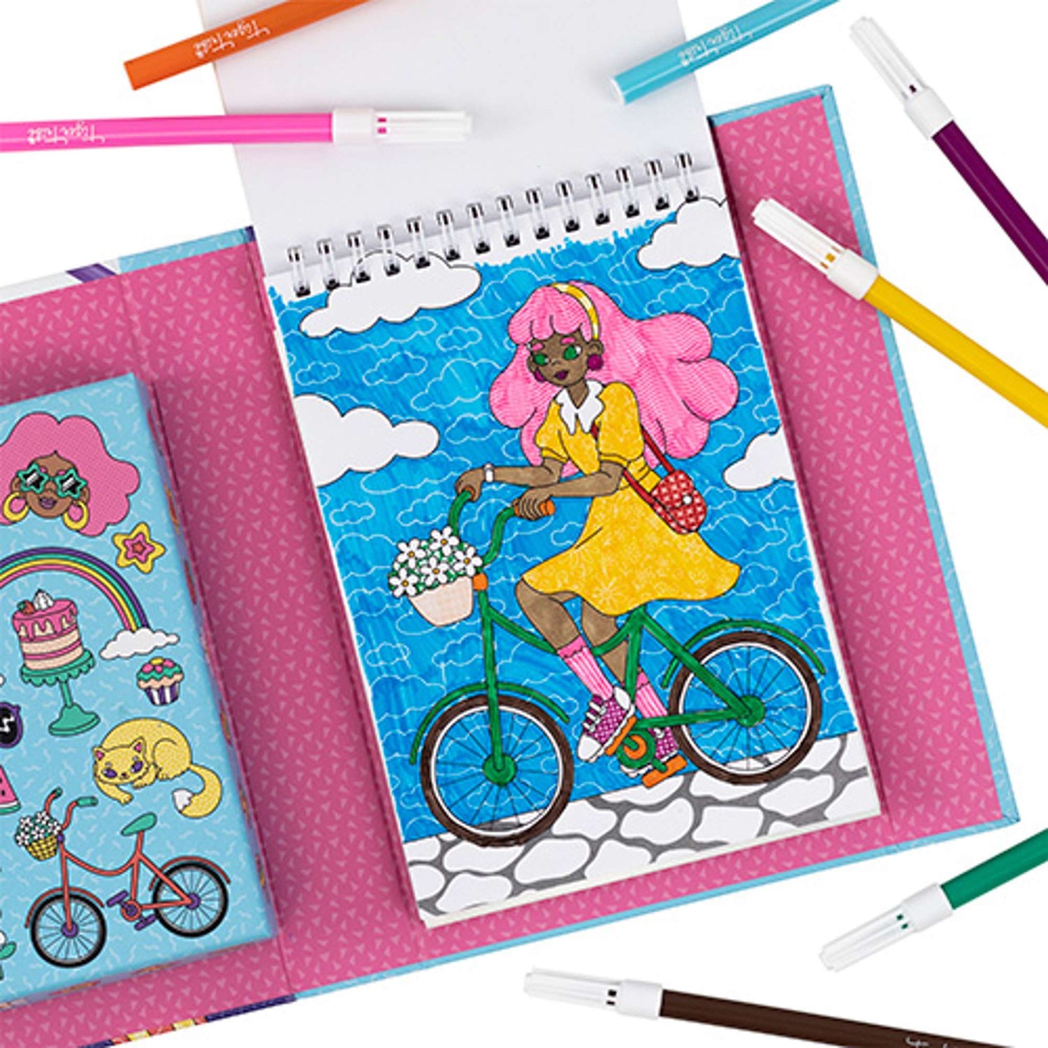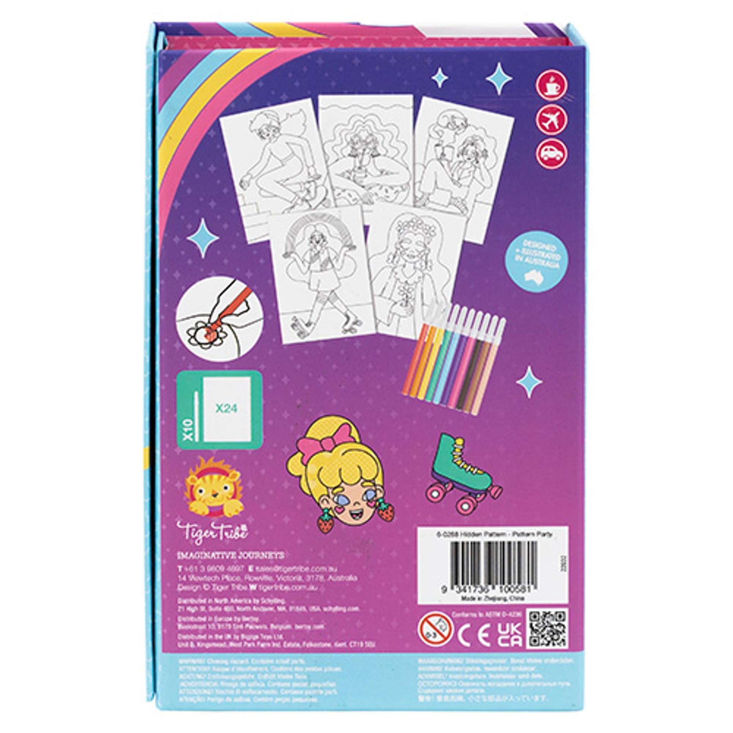 Enjoy colouring in with a groovy twist with Tiger Tribe's Pattern Party Hidden Pattern Set! This disco drawing set is packed with retro designs like roller discos and skateboarders, each illlustration hiding secret shapes for your little artist discover!