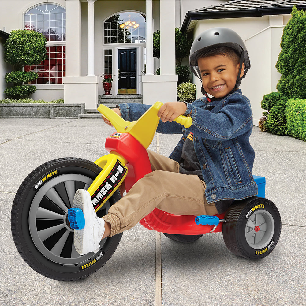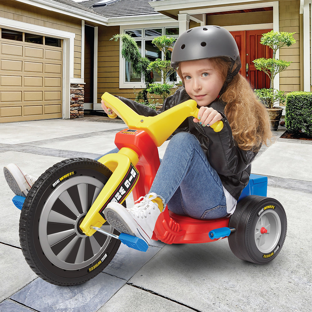 Dinky drivers can ride off into the sunset looking ultra-cool on their retro kids trike! Big Wheel Big Spin is a deluxe upgrade on the original Big Wheel Speedster. It features the same popping primary colours and oversized 16-inch front wheel, but with a few fun additions.