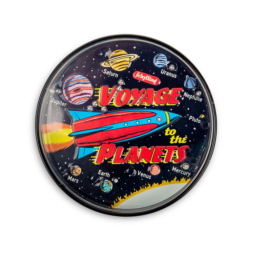 A blast from the past, Schylling's Tin BB Game helps to pass the time as little hands attempt to roll the small metal balls around the puzzle, depositing them in the correct holes.