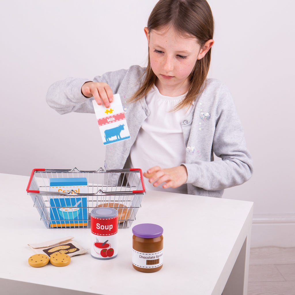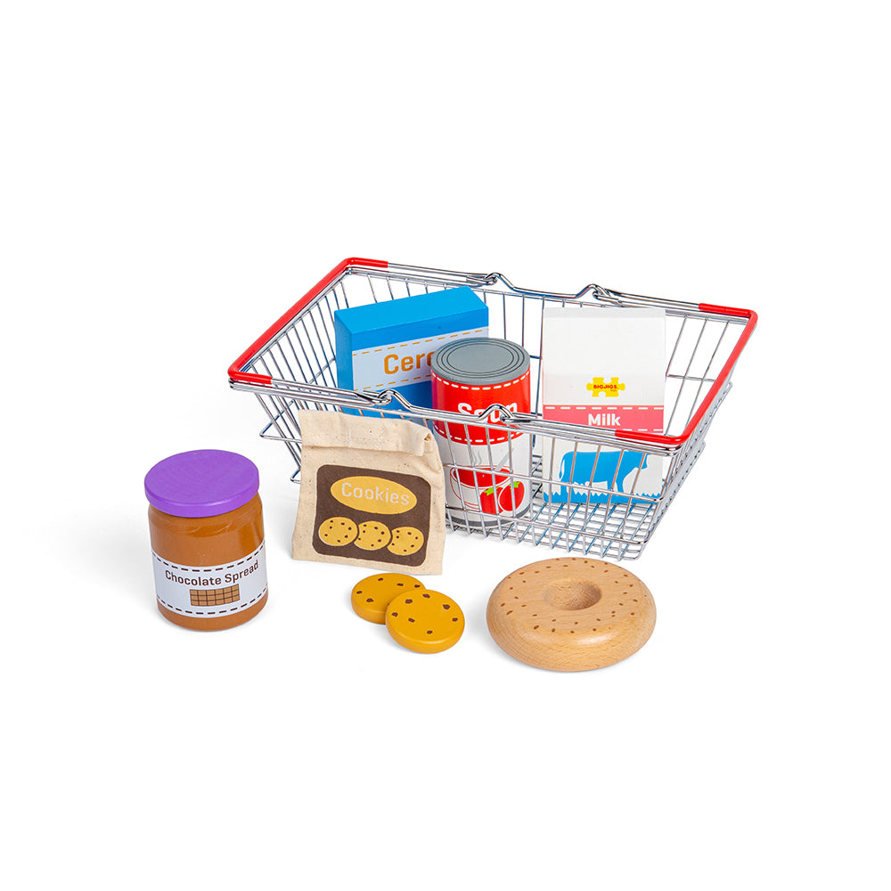 - 1x wire shopping basket with milk, cereal, soup, cookies, chocolate spread & bread