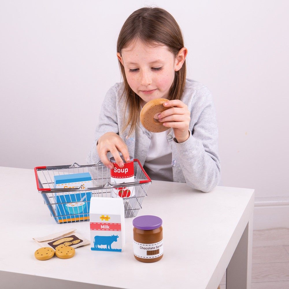 Our granddaughter loves her shopping basket (well made and will last a long time) and spends hours in her pretend supermarket. The only downside are the little wooden biscuits which she puts into her mouth