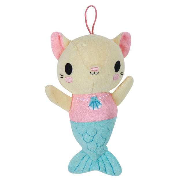 Splash Buddy Mercat has an adorable smile and comes with a beautiful pink and blue mermaid outfit. The mermaid cat bath toy's terry towelling material is fast drying bath netting; so when bath time is over, simply rinse, squeeze and hang out to dry with the useful hanging loop.