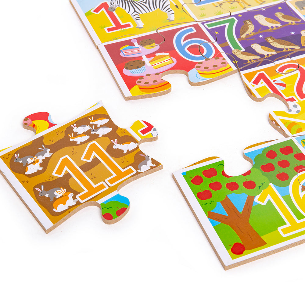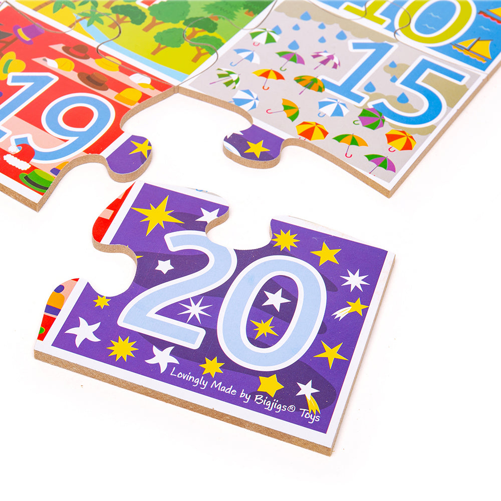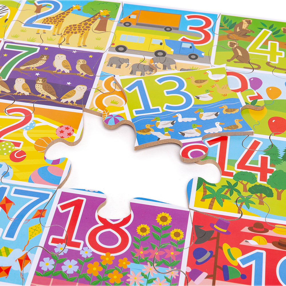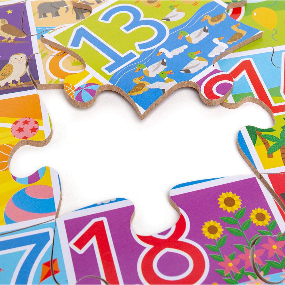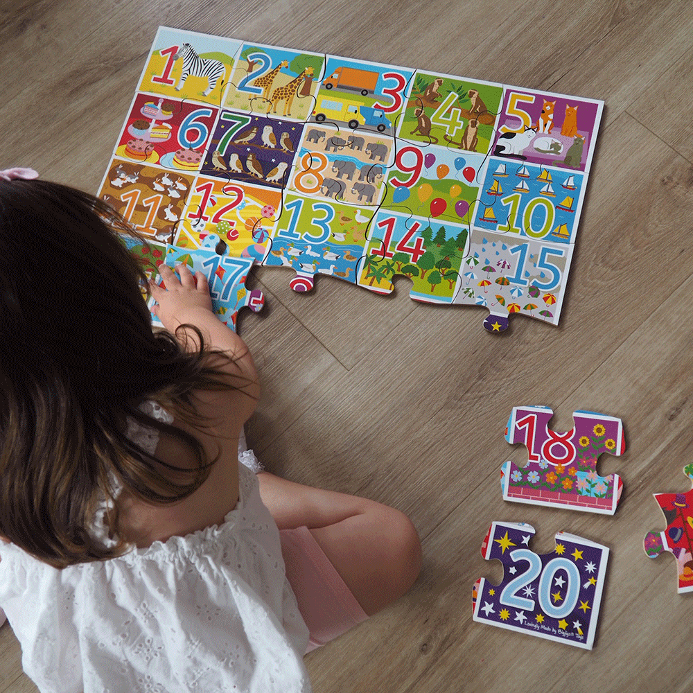 Match up the colourful puzzle pieces in the correct order from 1 to 20. This fantastically simple educational toy uses bright, bold colours and illustrations to help make counting and number recognition fun. Each colourful puzzle piece features a number of animals or objects, which add up to the number featured on the tile.