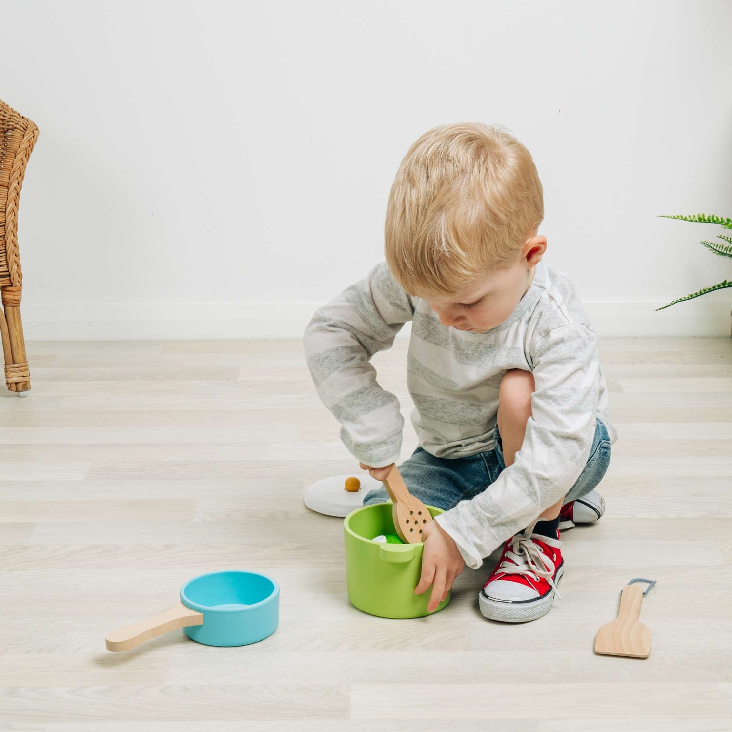 Educate young chefs about cooking and kitchen safety with our wooden role play Pots & Pans set. Kids can cook up a hearty stew in their stockpot or perfect the art of a poached egg in their saucepan! The set comes with three pots, two lids and two cooking utensils.