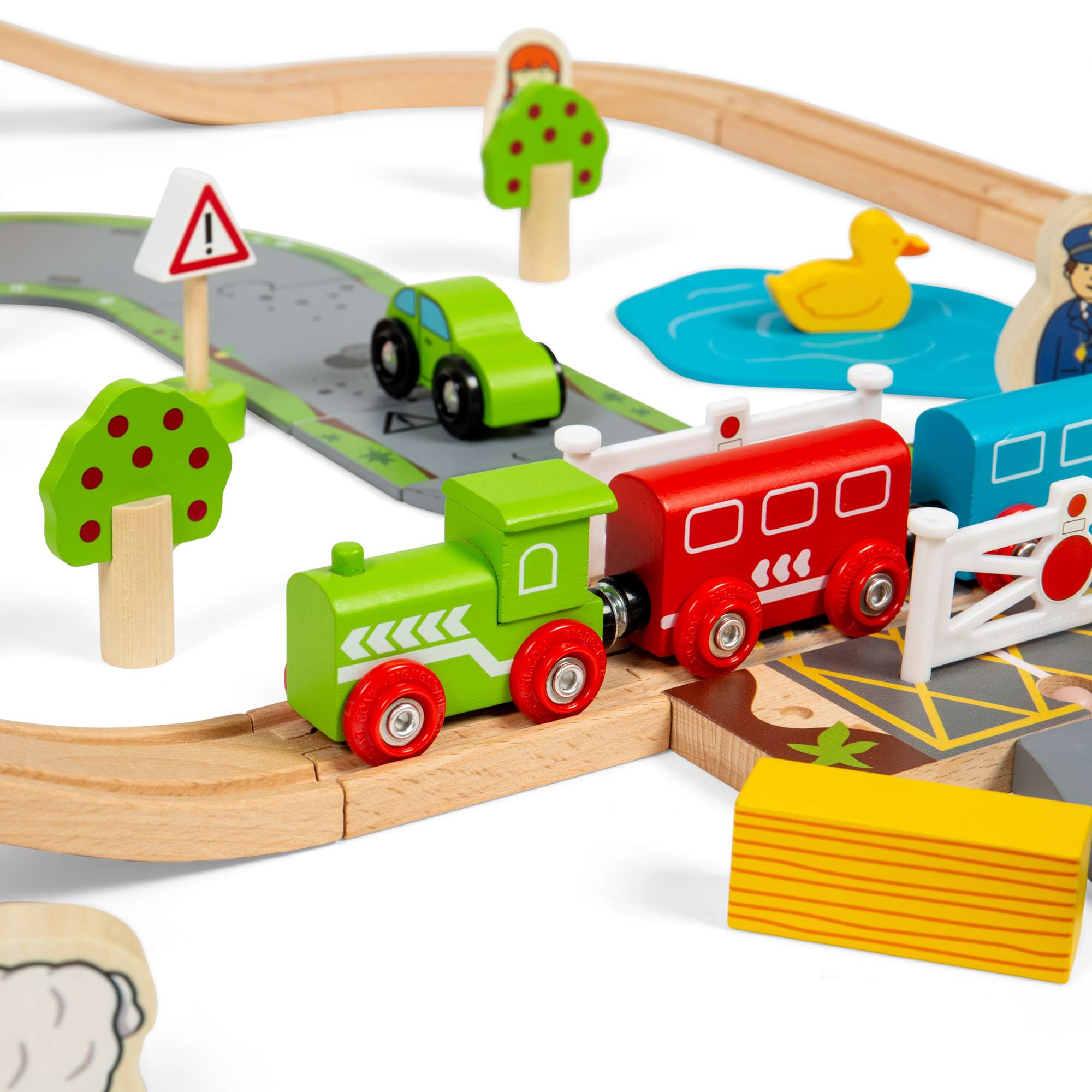 Bigjigs Rail Rural Rail and Road Set 90 Piece Wooden Train Set for Kids with Vehicles Animals and FSC Certified Track