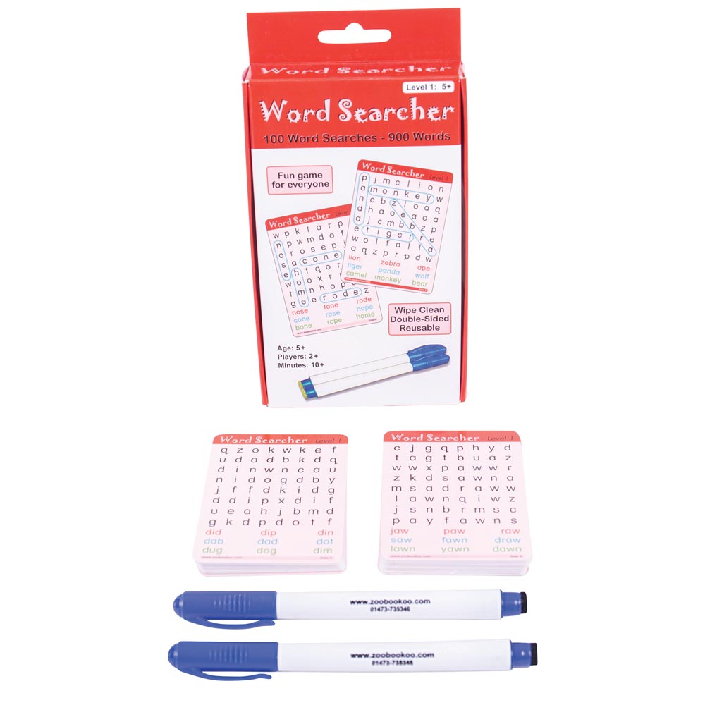 Everyone loves a word search, which is why the ZooBooKoo Word Searchers are such a hit! With two skill levels available the ZooBooKoo Word Search Games are great for learning and improving spelling as well as building vocabulary. Word Searcher - Level 1 includes 100 reusable wipe clean word search puzzles with 9 words at the bottom of each card. Suitable for up to 4 players, the cards are shared out evenly between all players. The players must then try to find all of the words at the bottom of their cards as quickly as possible - marking them off as they go with a dry wipe pen. The first player to find all 9 words is the round winner and gets all of the cards used within that round. Repeat. The winner is the player with the most cards at the end of the game. Supplied in a neat pack the ZooBooKoo Word Searchers are great for keeping kids amused when travelling, and to help enhance vocabulary and general literacy skills. Set includes 2 standard dry wipe pens. Great for use within the classroom, at home or on the move - infectious fun learning all of the time. Conforms to current European safety standards.