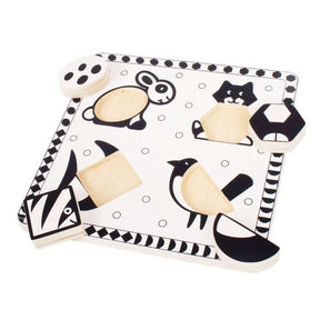 This wooden puzzle has been specifically designed in black and white, due to the fact that black and white are the easiest colours for young children to see and respond to. Each of the four puzzle pieces can be slotted into the animal illustrations and will aid your child's development as they learn to identify and place each one. Each chunky wooden puzzle piece is generously sized to make it easier for little hands to lift, grasp, examine and replace. Helps to develop dexterity, matching skills and concentration. Made from high quality, sustainably sourced FSC® Certified wood. Conforms to current European safety standards. 4 puzzle pieces.