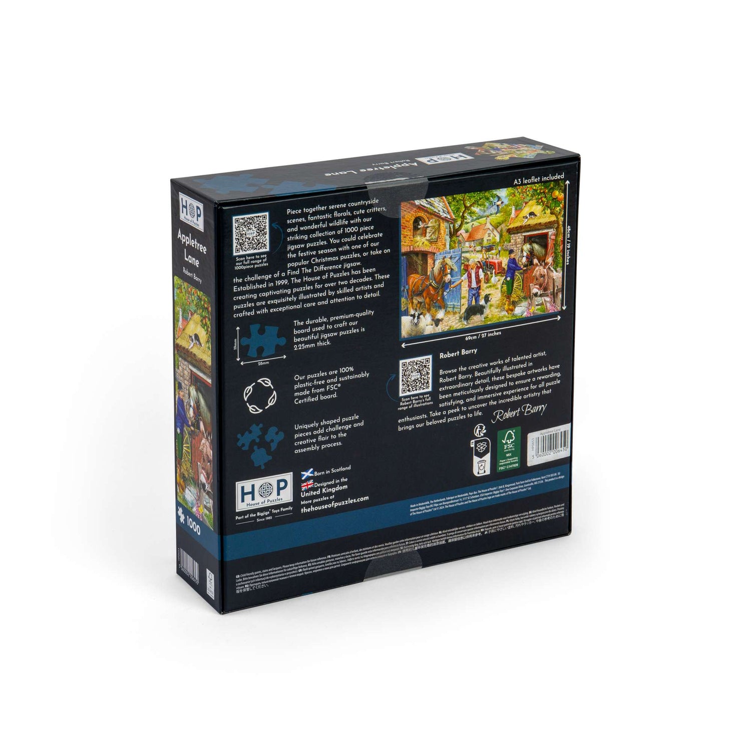 Get ready to start your next House of Puzzles project! Illustrated by extraordinary artist Robert Barry, the Appletree Lane 1000 piece jigsaw features a beautifully detailed scene to captivate both beginner and seasoned puzzle fanatics! All of our 1000 piece jigsaw puzzles are sustainably made from premium quality FSC® Certified board, promising a satisfying and seamless assembly experience. Completed puzzle dimensions: 48 x 69cm.