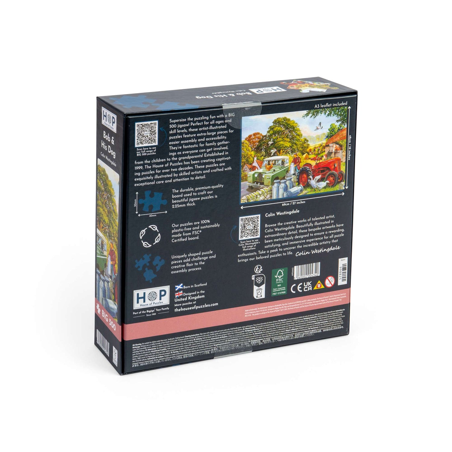 Go large with this Big 500 piece jigsaw puzzle! Illustrated by talented artist Colin Westingdale, our Bob & His Dog jigsaw features extra-large puzzle pieces which are easier to handle and slot into place. The Big 500 range is a perfect family activity, as the chunky jigsaw pieces enable all ages to join in and work together. All of our Big 500 piece puzzles are sustainably made from premium quality FSC® Certified board, promising a satisfying and seamless assembly experience. Completed puzzle dimensions: 48 x 69cm.