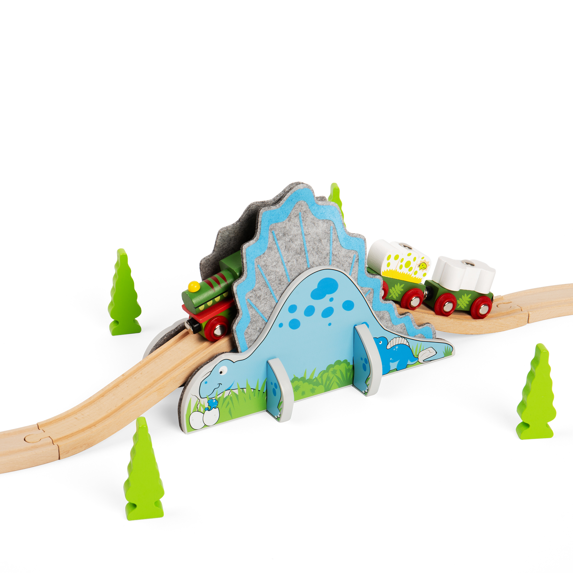 Dino-soar up the ramp, speed through the tunnel, then fly down the track! This Dino Riser Tunnel is guaranteed to add some excitement to your kiddie's train set. It features a felt spine which velcros together to create the train tunnel, alongside two pieces of ascending/descending track.