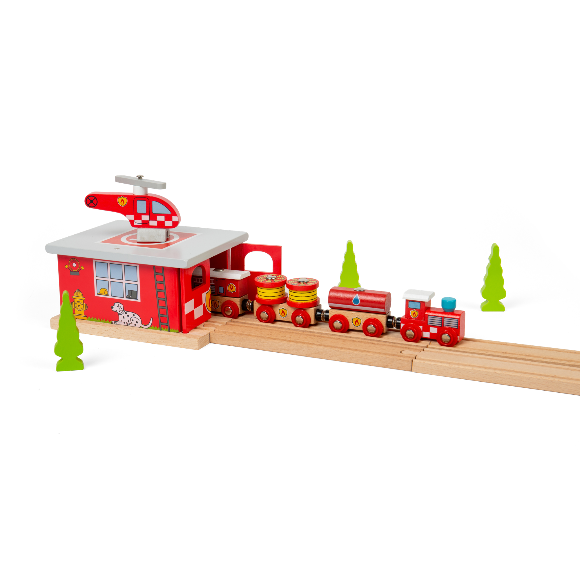 The perfect resting place for the Bigjigs Rail Fire and Rescue Train! There's room for two train engines in this dedicated fire station shed with working doors. Supplied with a helipad and fire rescue helicopter, this fantastic wooden train accessory is sure to add some excitement to any wooden railway.