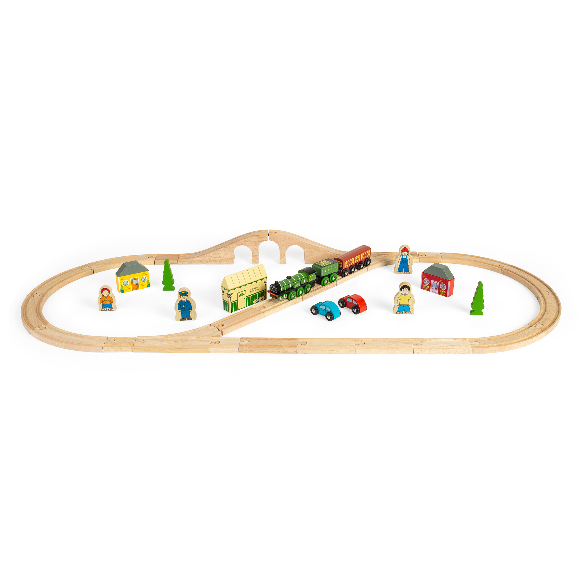 A ticket office, cars, trees, workmen and village folk also help to complete the country landscape. The Flying Scotsman is a classic wooden train set that will never go out of fashion. Consists of 42 play pieces.
