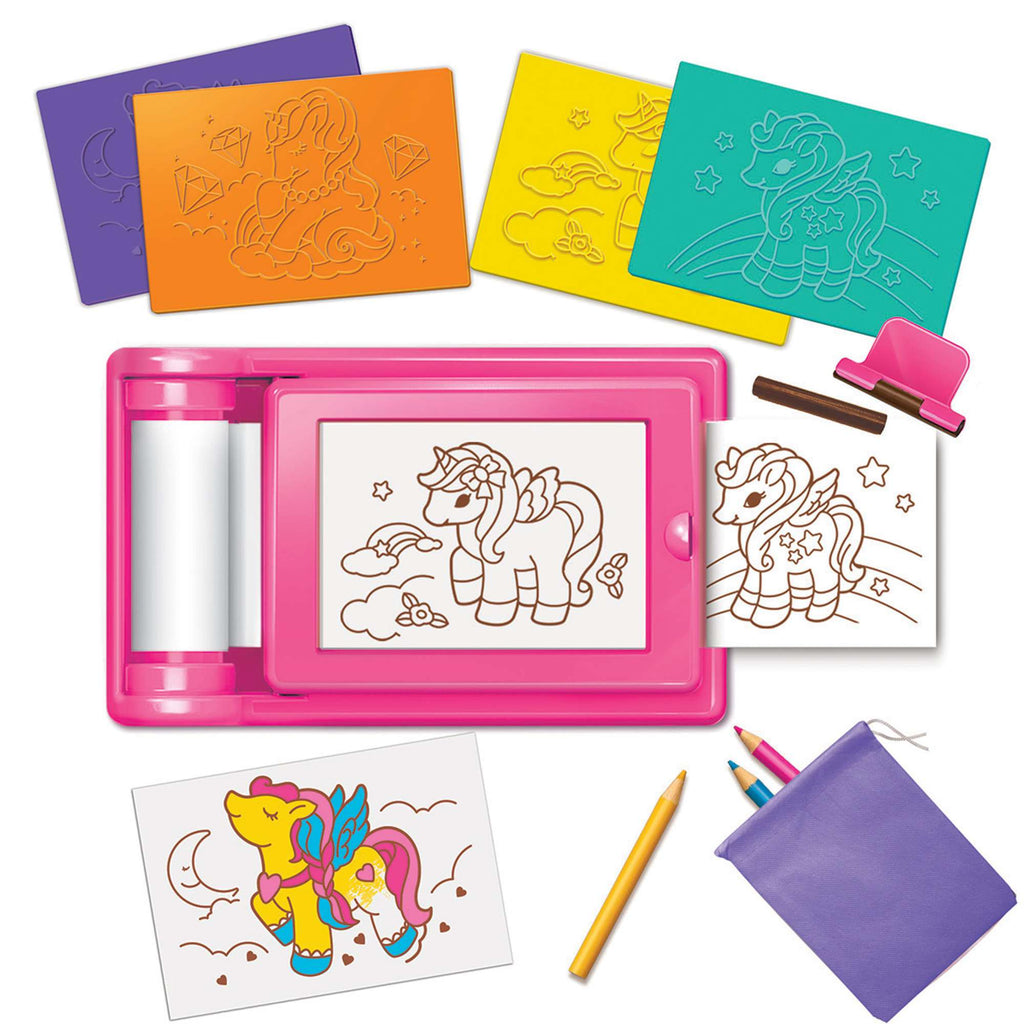Ideal for children aged 4 years and up, the KidzMaker Unicorn Rub Art Studio supports creative growth through interactive unicorn-themed activities. Engaging with vibrant art supplies, kids develop fine motor skills and confidence, making the studio an enriching educational gift for young artists.