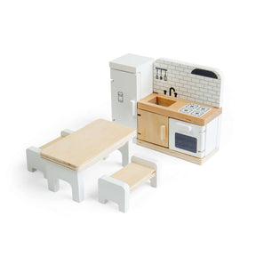 A beautiful modern kitchen for your dolls to enjoy, this set features 5 dolls house accessoriesto play with, including a white fridge, oven, grill and sink unit along with a table and benches to set the scene. Designed for our Summer Cottage Dolls House, this dolls house kitchen is made from ethically sourced premium quality FSC® Certified wood, helping to protect our woodlands and providing fun for generations to come.