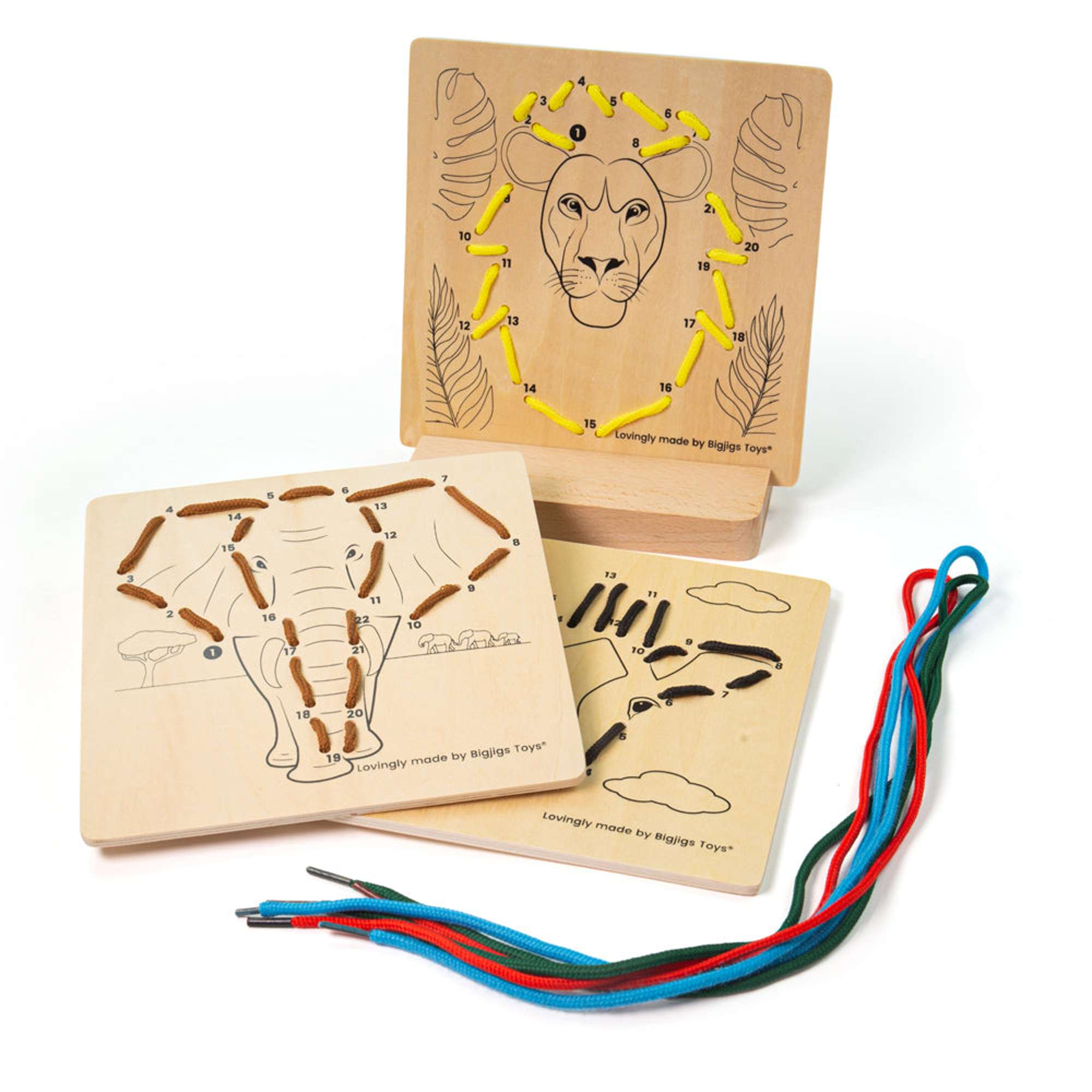 Our Jungle Lacing Game For Toddlers features three different wild animals including an elephant, lion and a giraffe. Little hands need to simply thread the laces in numerical order for the jungle animal picture to appear!