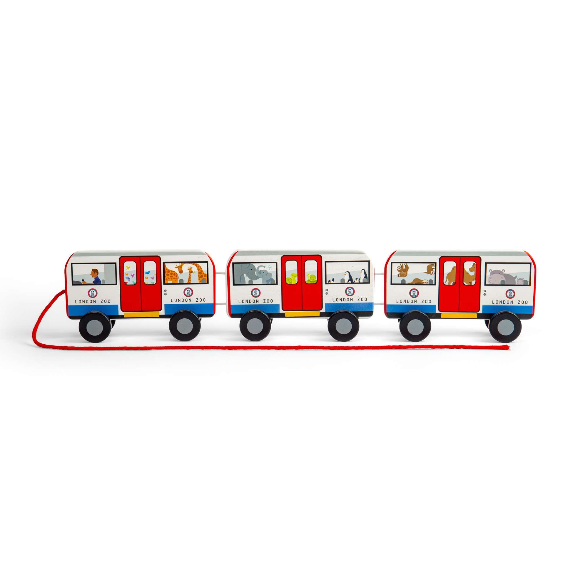 Please mind the gap! Capturing the essence of the city’s historic underground, our London Pull Along Tube features three wooden carriages and a red pull along cord. Travelling on the tube is a bunch of wild passengers en route to London Zoo! Spot giraffes, elephants, penguins, sloths, hippos, and more on board.