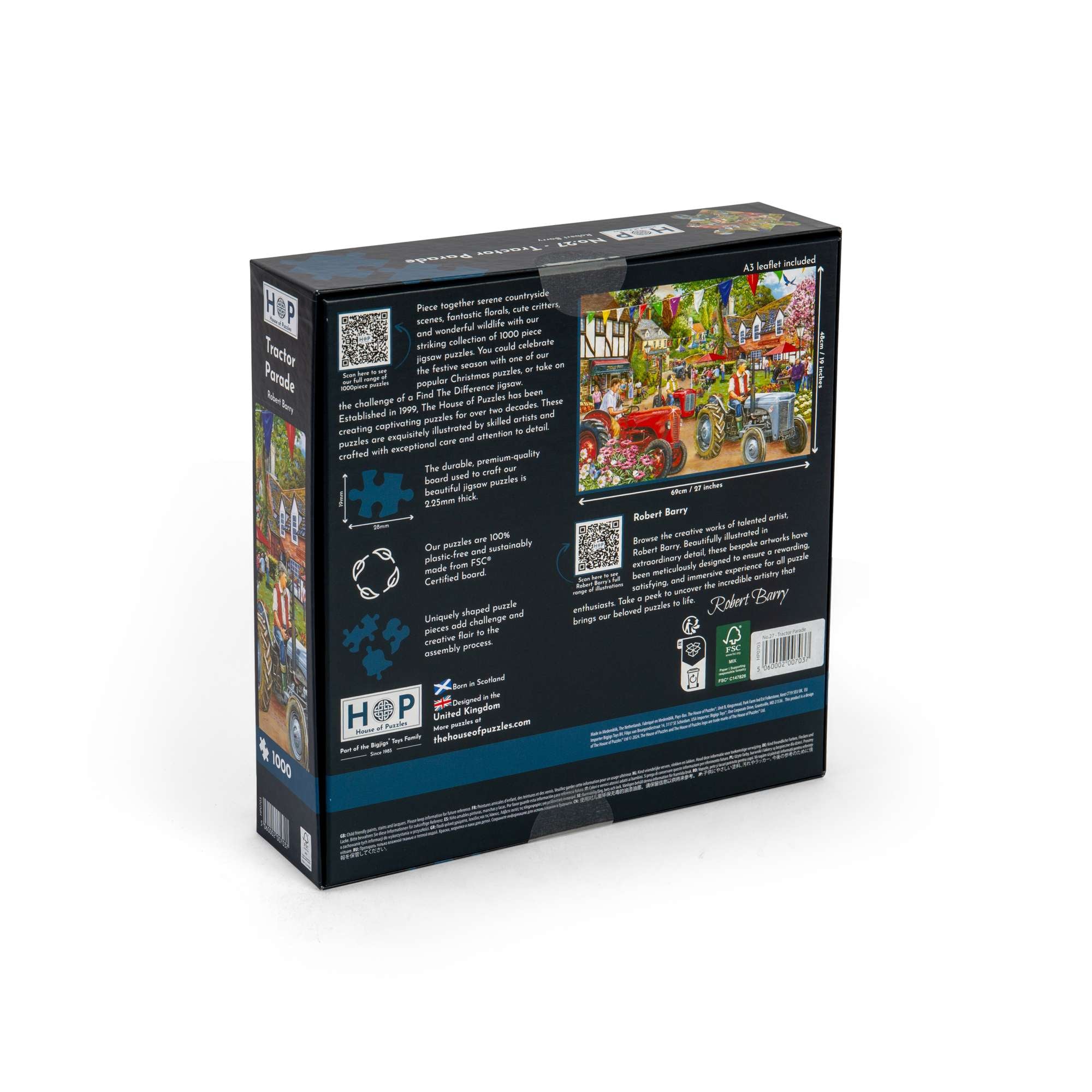 Get ready to start your next House of Puzzles project! Illustrated by extraordinary artist Robert Barry, the Tractor Parade 1000 piece jigsaw features a beautifully detailed scene to captivate both beginner and seasoned puzzle fanatics! All of our 1000 piece jigsaw puzzles are sustainably made from premium quality FSC® Certified board, promising a satisfying and seamless assembly experience. Completed puzzle dimensions: 48 x 69cm.