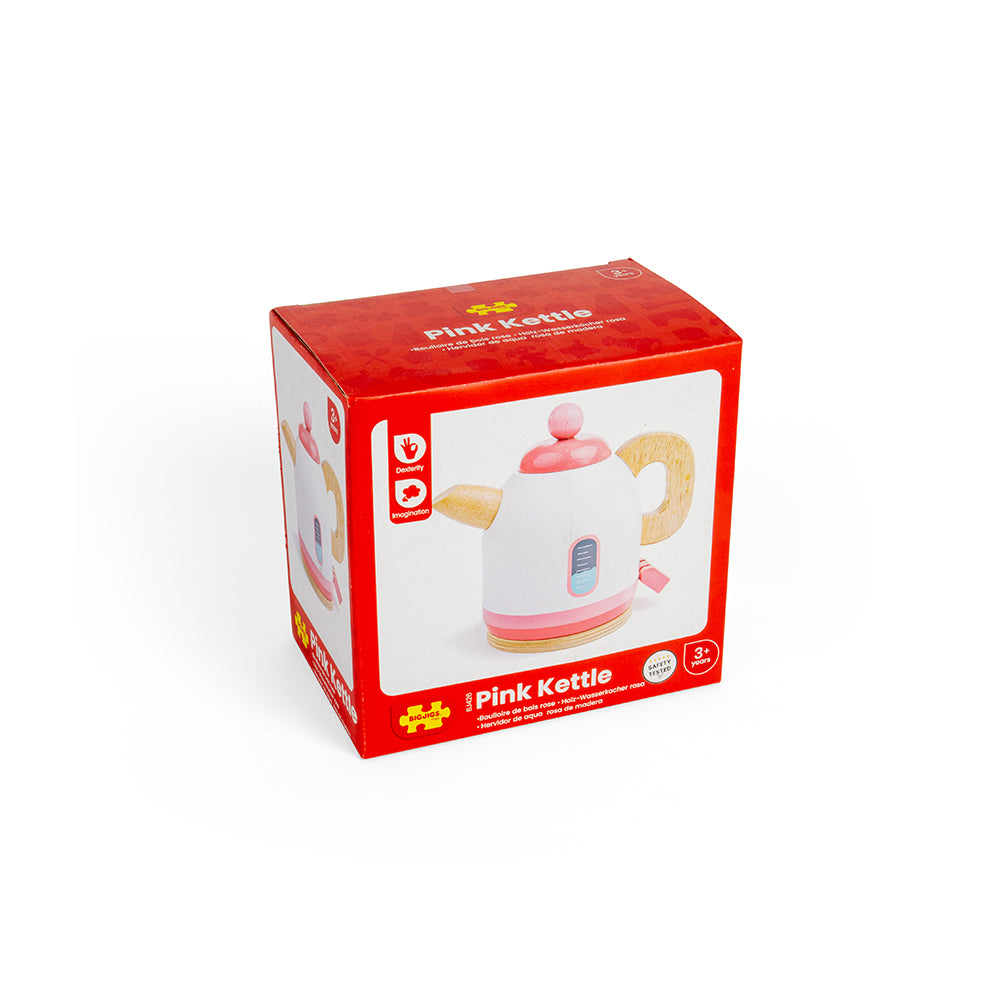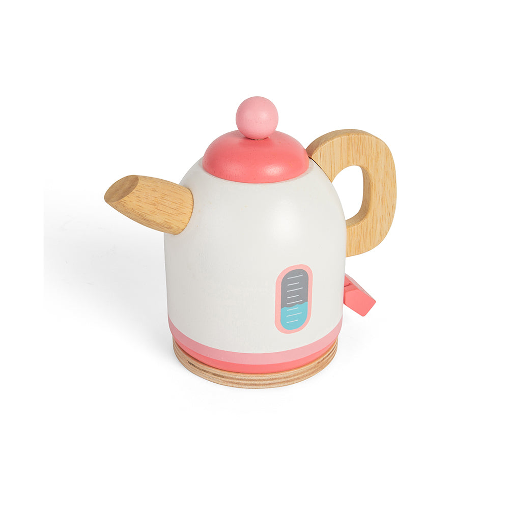 Mini hosts and hostesses will love making cups of tea for everyone with this sturdy pink wooden toy kettle. Colourful and detailed, it features an easy to grip handle that is perfectly sized for little hands, a lifelike switch and a removable lid.
