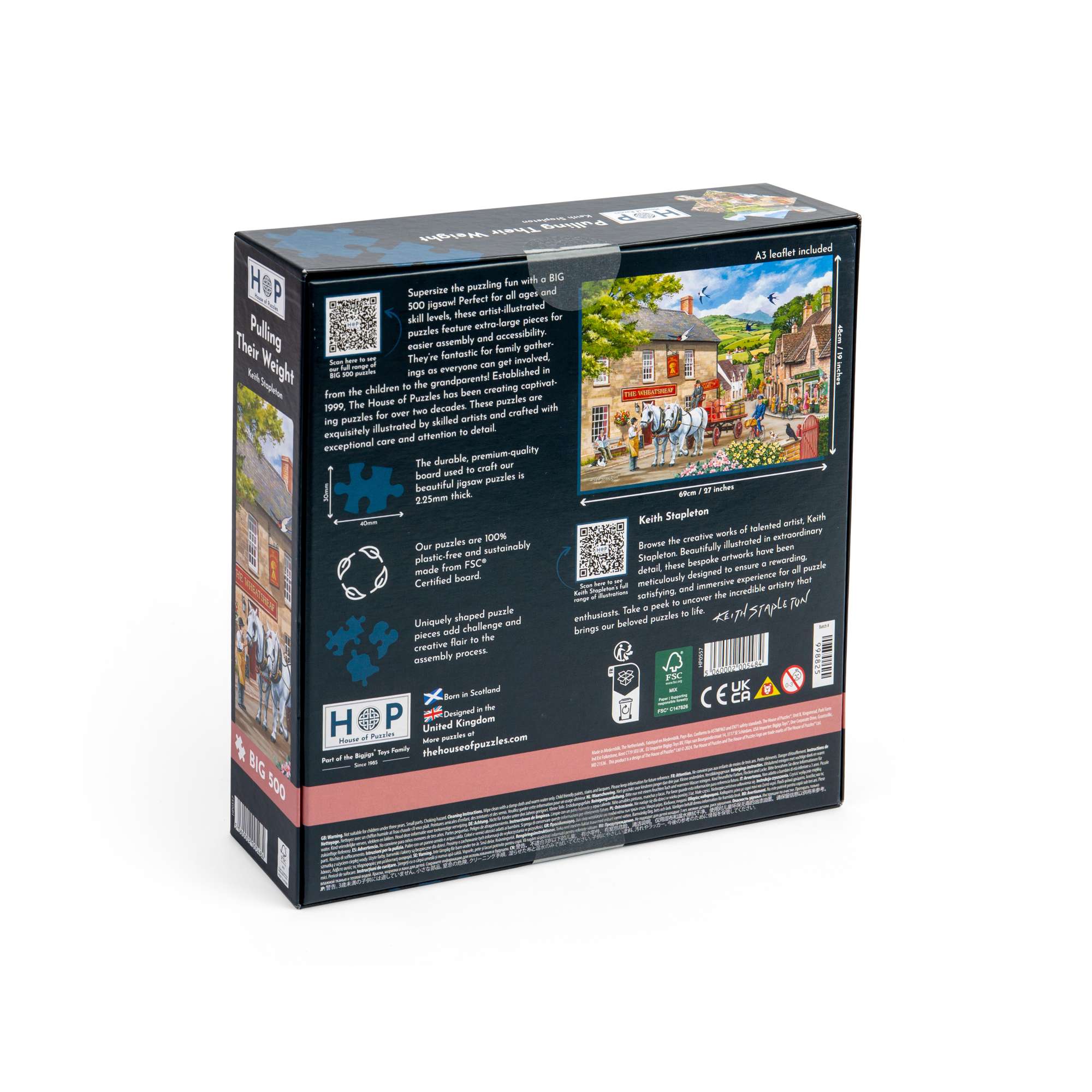Go large with this Big 500 piece jigsaw puzzle! Illustrated by talented artist Keith Stapleton, our Pulling Their Weight jigsaw features extra-large puzzle pieces which are easier to handle and slot into place. The Big 500 range is a perfect family activity, as the chunky jigsaw pieces enable all ages to join in and work together. All of our Big 500 piece puzzles are sustainably made from premium quality FSC® Certified board, promising a satisfying and seamless assembly experience. Completed puzzle dimensions: 48 x 69cm.