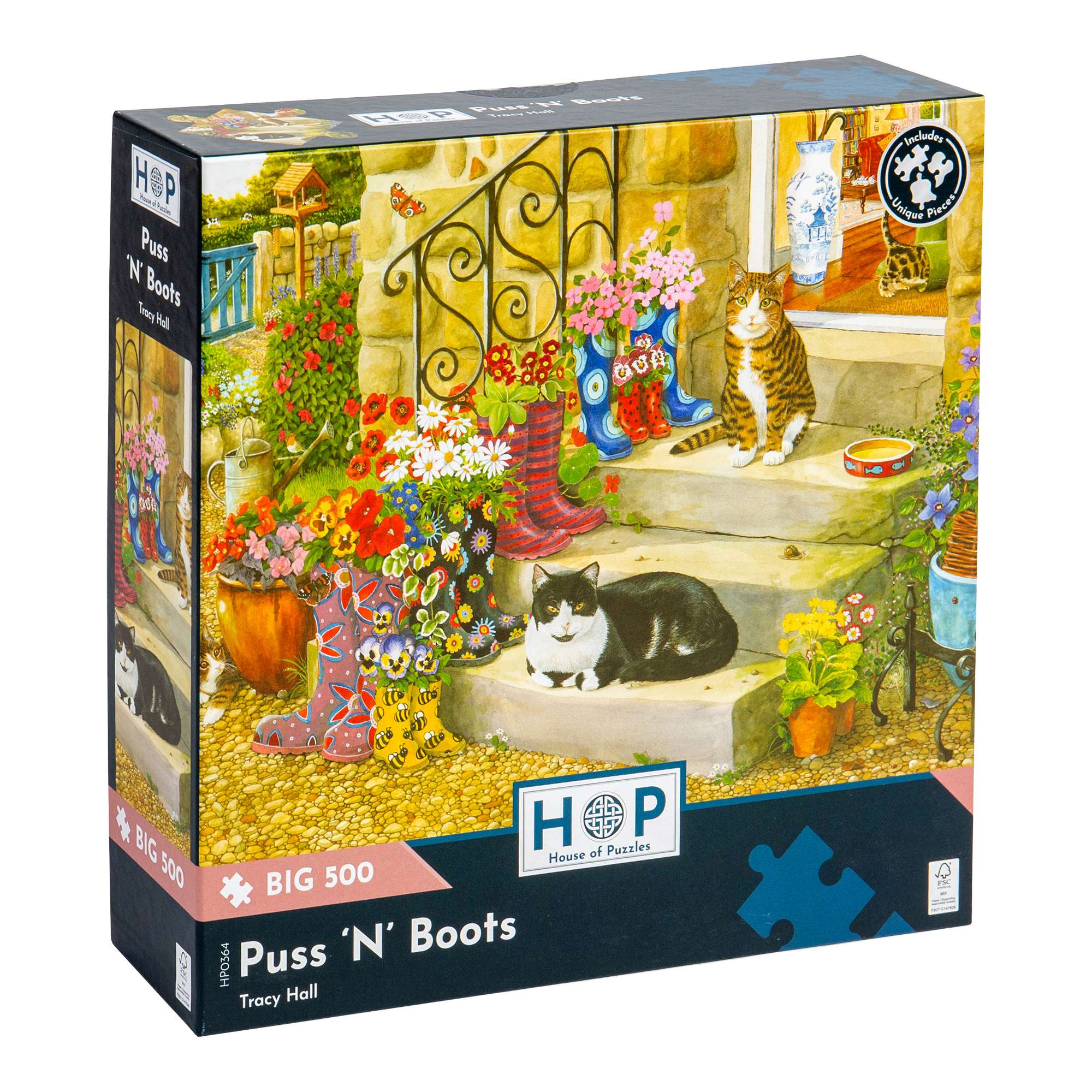 Go large with this Big 500 piece jigsaw puzzle! Illustrated by talented artist Tracy Hall, our Puss 'N' Boots jigsaw features extra-large puzzle pieces which are easier to handle and slot into place. The Big 500 range is a perfect family activity, as the chunky jigsaw pieces enable all ages to join in and work together. All of our Big 500 piece puzzles are sustainably made from premium quality FSC® Certified board, promising a satisfying and seamless assembly experience. Completed puzzle dimensions: 48 x 69cm.