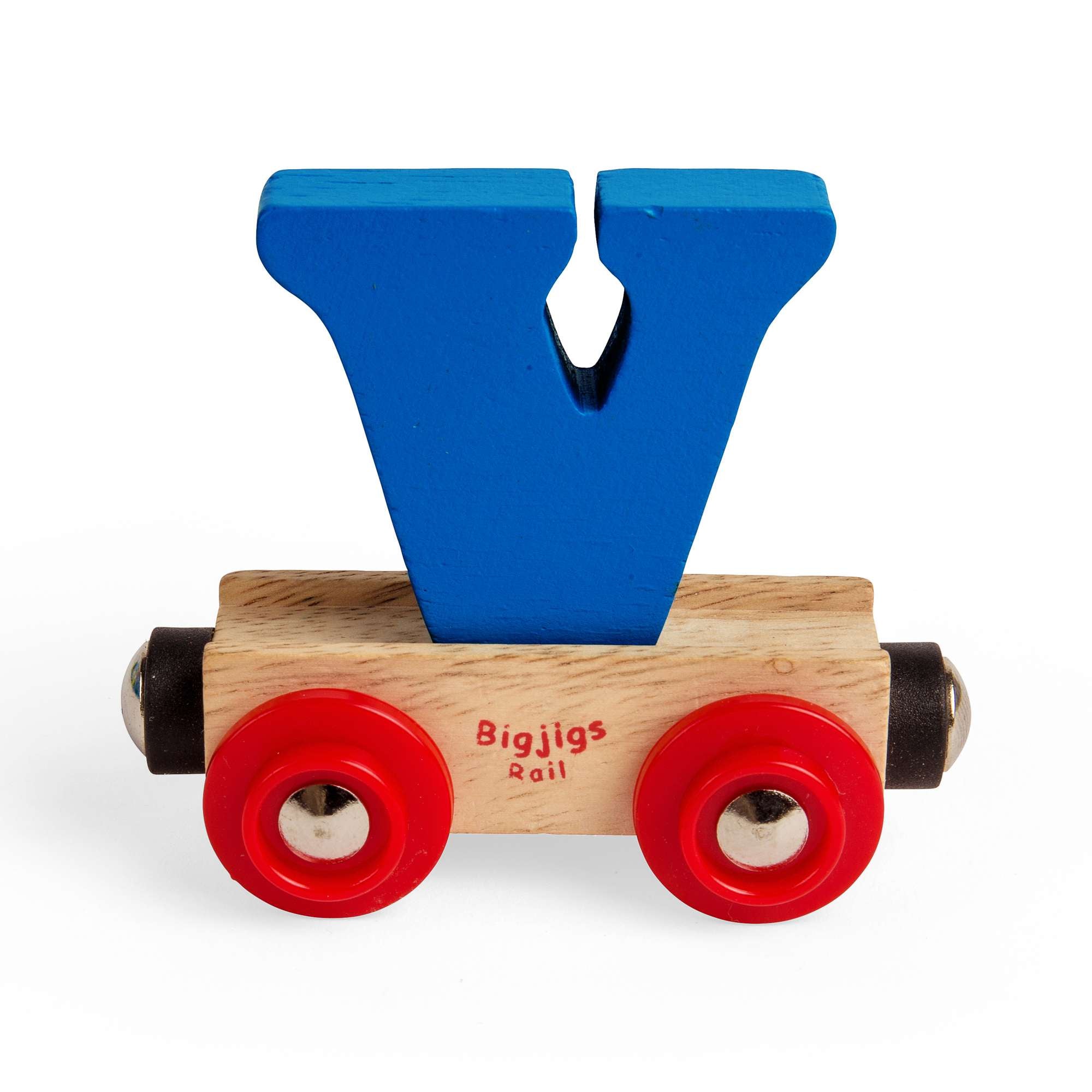 Bigjigs Rail Name carriages are loaded with a brightly coloured wooden letter or number. Each letter or number is removable and can be interchanged with other wagons and carriages in your wooden train set.
