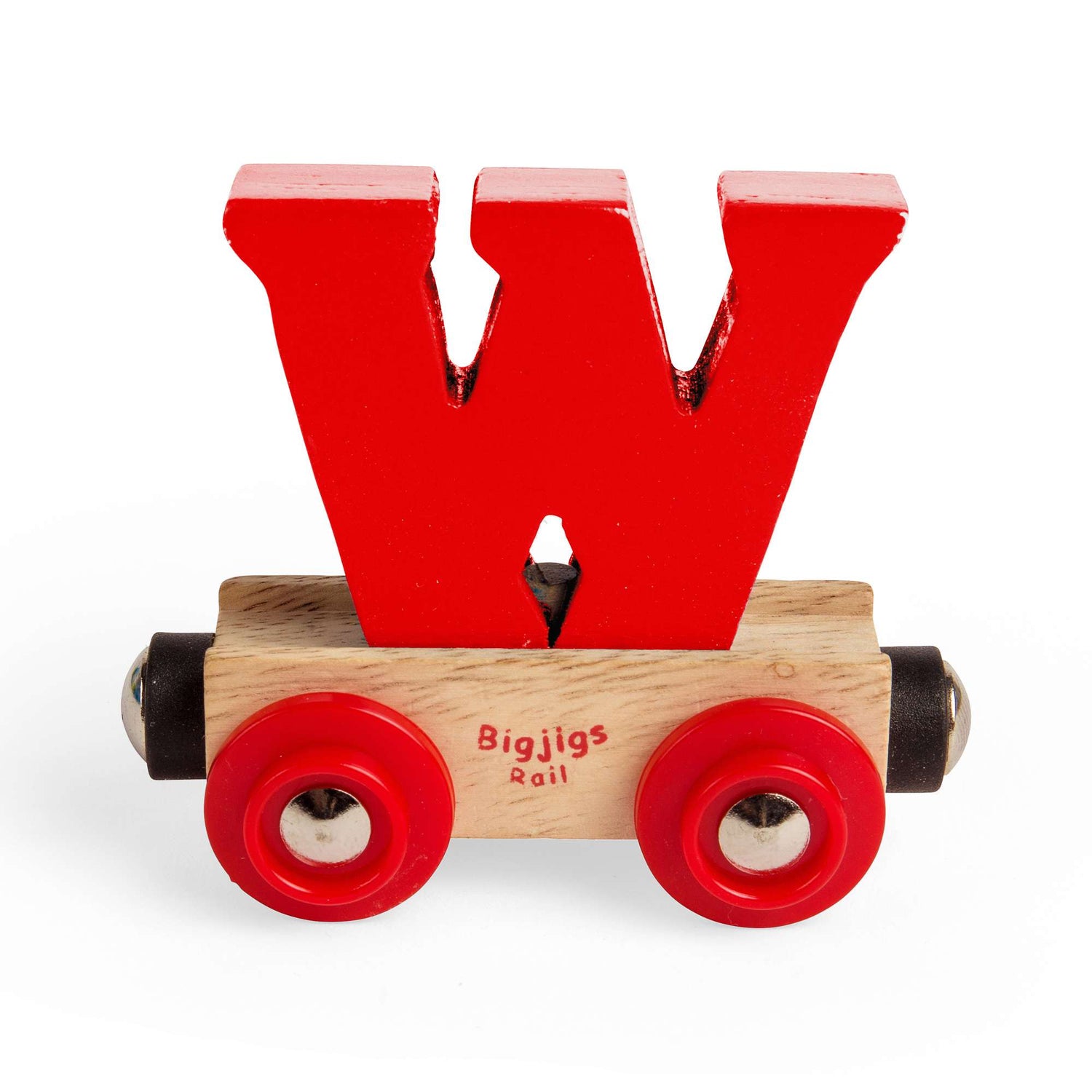 Bigjigs Rail Name carriages are loaded with a brightly coloured wooden letter or number. Each letter or number is removable and can be interchanged with other wagons and carriages in your wooden train set.