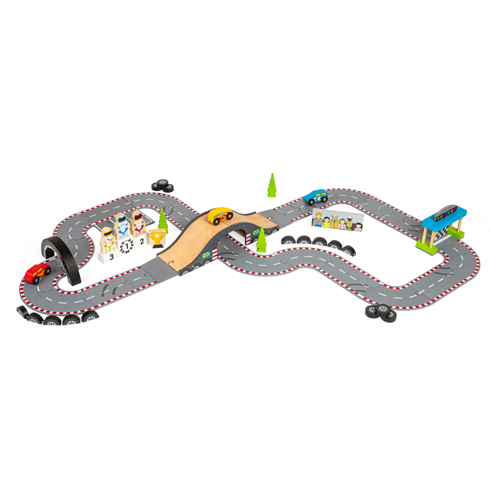 Roadway Race Day Set by Bigjigs Rail is a premium wooden race track toy with cars, drivers, and accessories for creative play