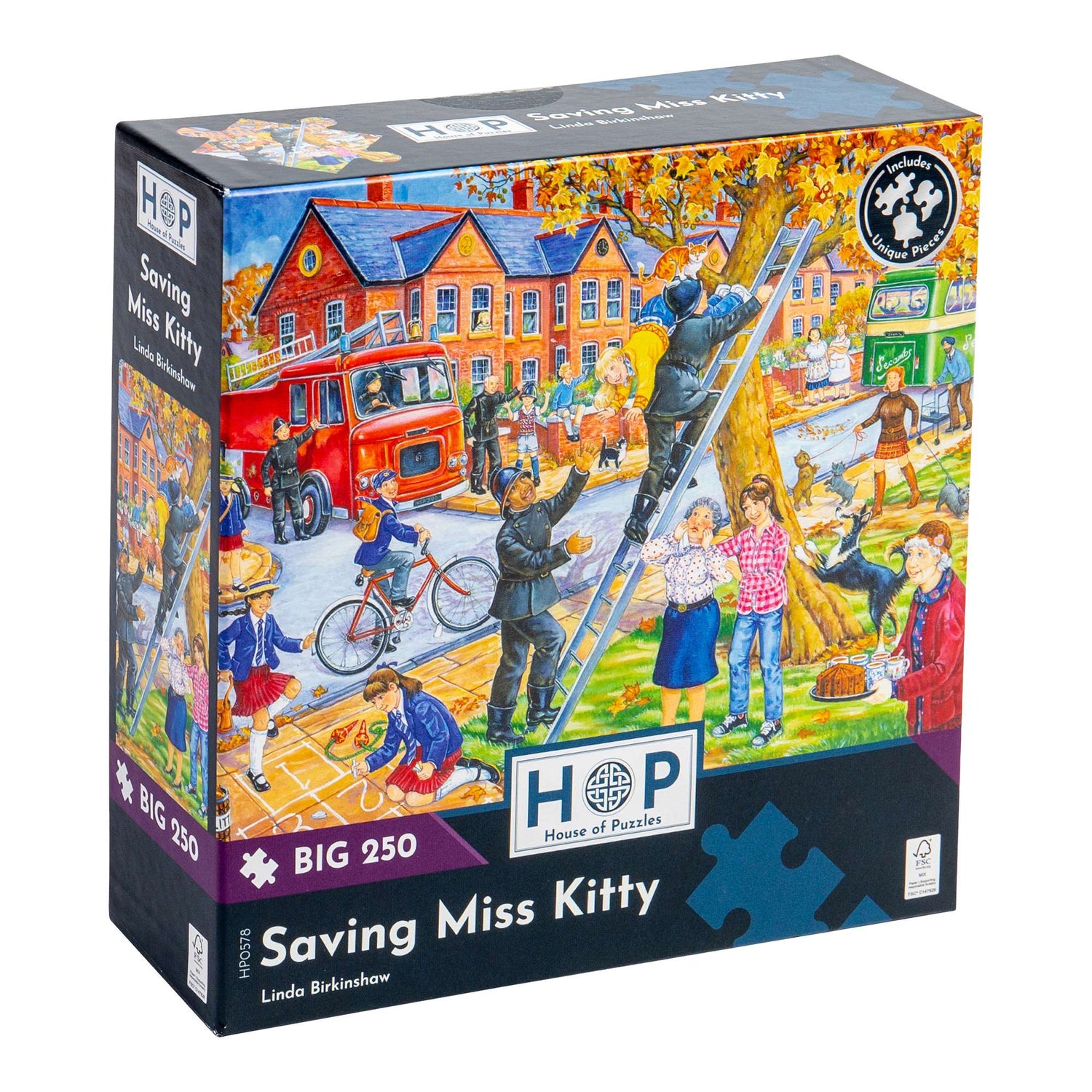 Hugely entertaining and enormously fun, our Big 250 piece jigsaw puzzles will tempt the whole family to get stuck in! The Saving Miss Kitty jigsaw puzzle features charming illustrations by amazing artist Ray Cresswell and has extra-large puzzle pieces for easier assembly, enabling all ages to join in! All of our Big 250 piece puzzles are sustainably made from premium quality FSC® Certified board. Completed puzzle dimensions: 34 x 48cm.