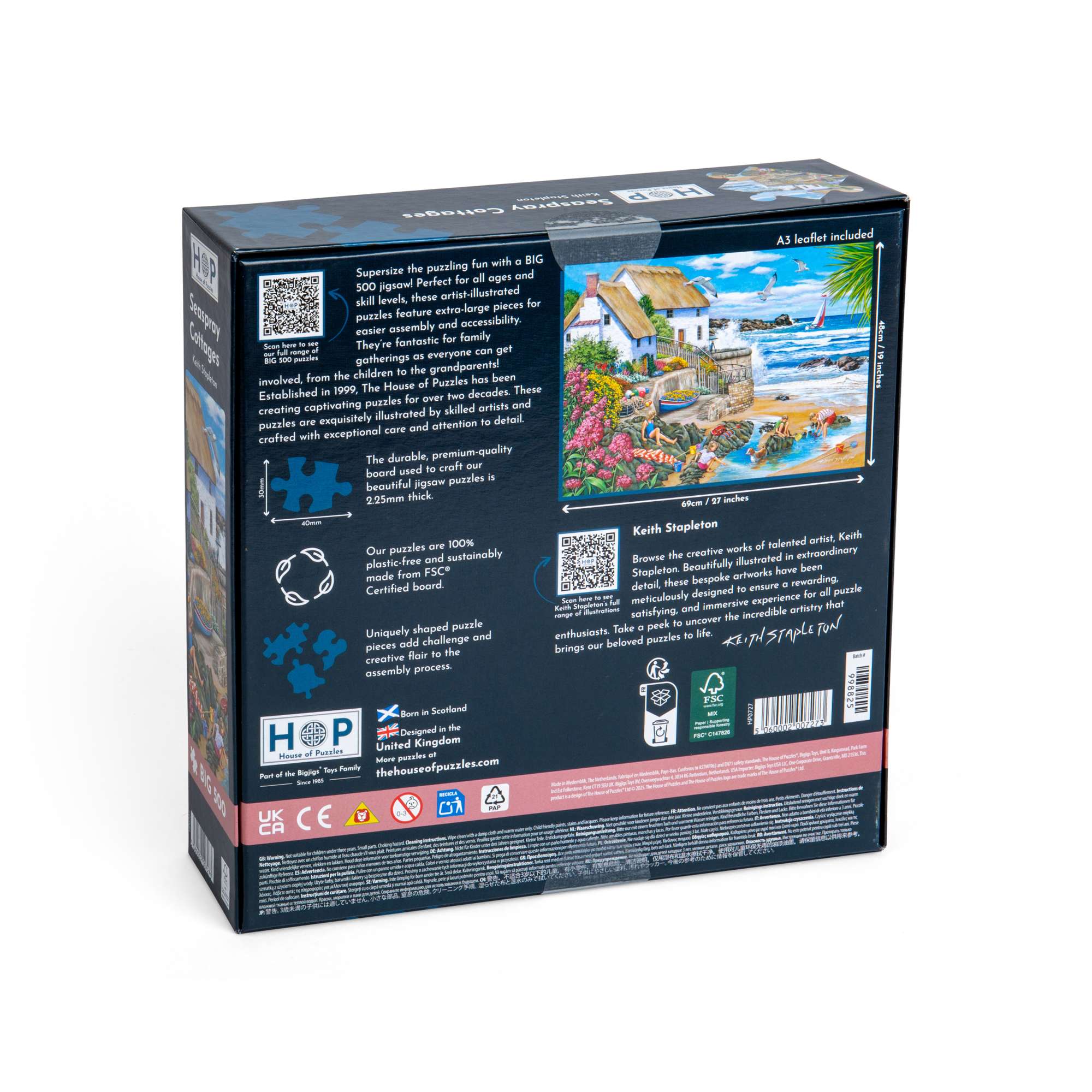 Go large with this Big 500 piece jigsaw puzzle! Illustrated by talented artist Keith Stapleton, our Seaspray Cottages jigsaw features extra-large puzzle pieces which are easier to handle and slot into place. The Big 500 range is a perfect family activity, as the chunky jigsaw pieces enable all ages to join in and work together. All of our Big 500 piece puzzles are sustainably made from premium quality FSC® Certified board, promising a satisfying and seamless assembly experience. Completed puzzle dimensions: 48 x 69cm.