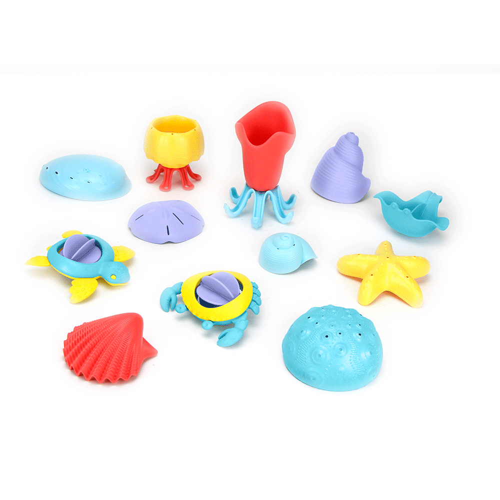 Made in the USA from 100% recycled plastic, each of the sea creatures in the set is designed to interact with and pour water in a variety of ways, helping children to develop their fine motor skills, dexterity and imagination.