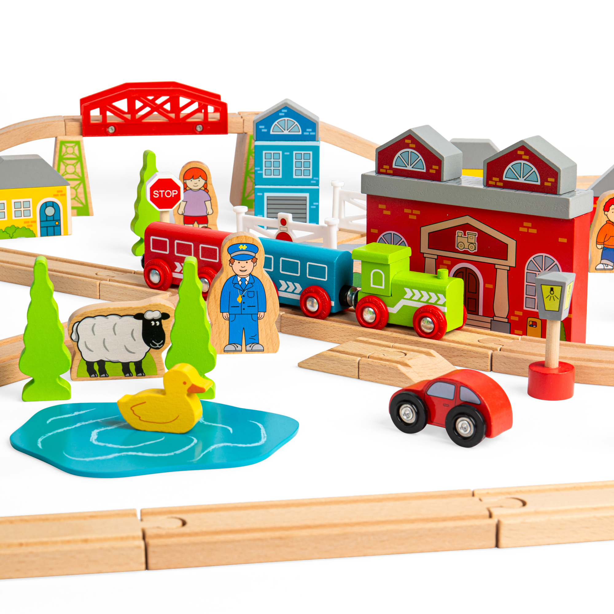 Bigjigs Rail Town and Country Wooden Train Set for Kids Ages 3 Plus with 91 Pieces and Compatible Tracks
