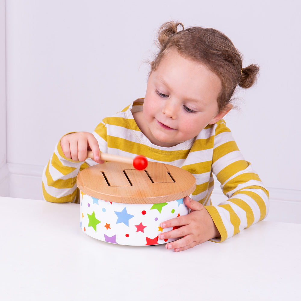 With each strike, young ears will be presented with a pleasant sound, encouraging them to strike the drum again and again, creating their own tune!