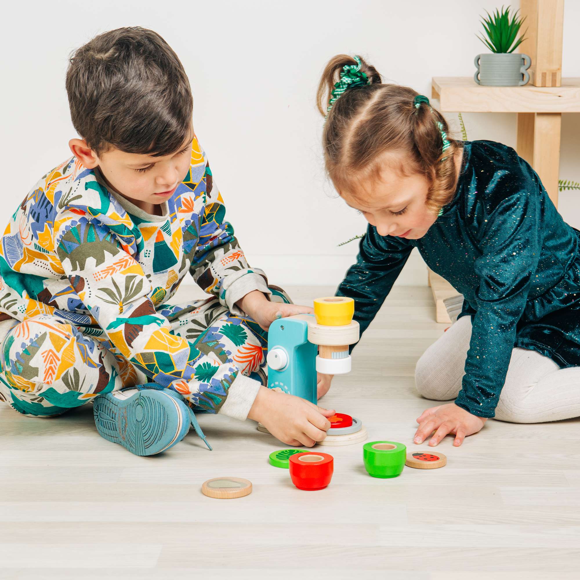 Curious youngsters can learn all about the natural world as they role play scientific discoveries with this colourful kids Microscope. It comes with 14 play pieces including a magnification lens, kaleidoscope lens and rose-tinted lens, alongside wooden disks featuring bugs and plants for kids to view and explore.
